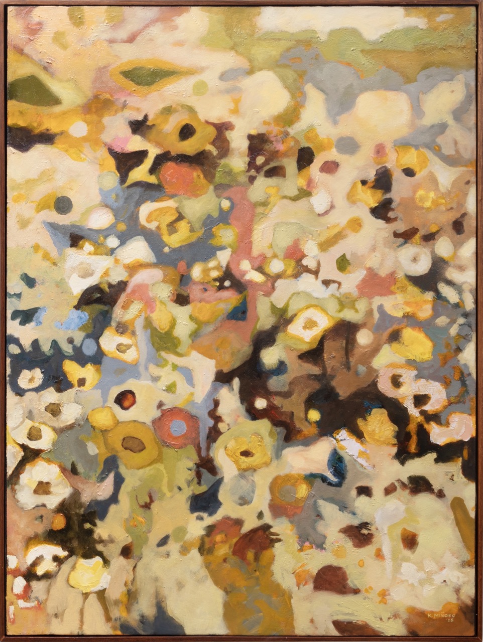 Miñoso’s landscapes are warm, sun-dappled. Wildflowers sway together, richly colored. No vase would cut them at the stem or contain them; they are free to turn their faces to the sun, seek water with their roots, and push through the grass, growing where they please. She notes, “Nature is not only soft. It is also wild, shifting, and self-determined.” So does she think of a woman’s identity.