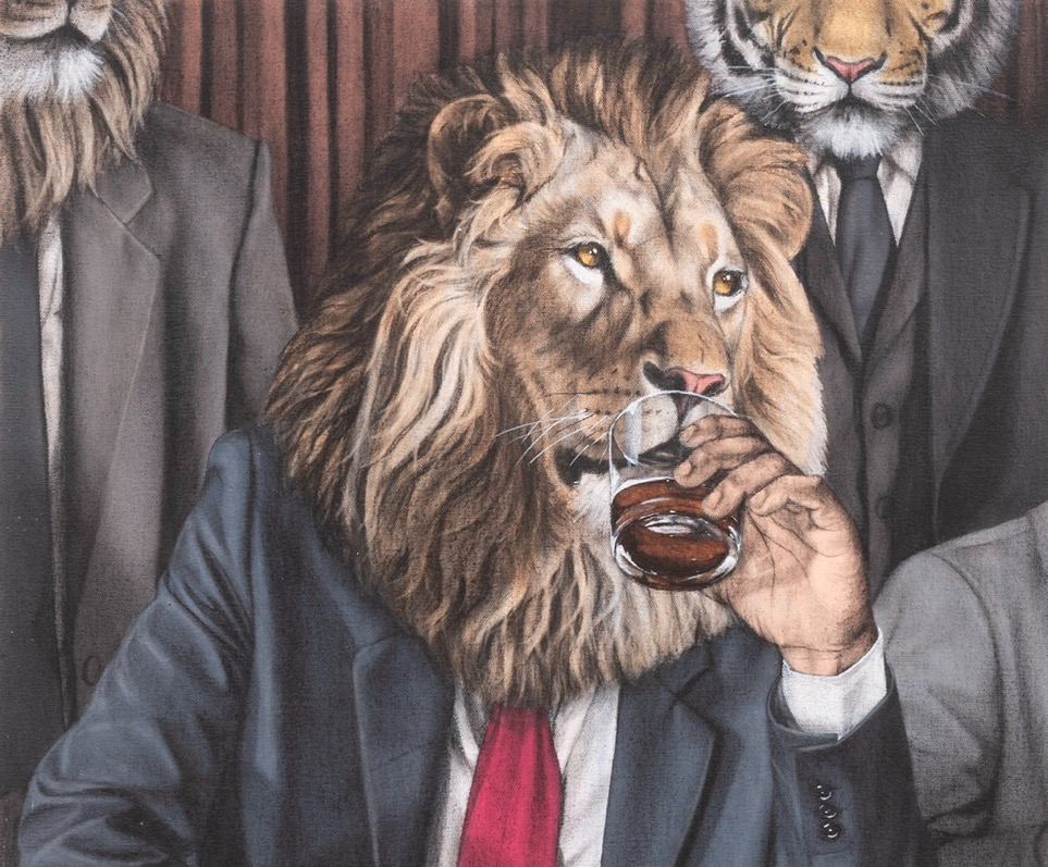In Magnus, Ramos reckons with humanity’s pursuit of glory in its most primal form. He presents portraits of his signature anthropomorphic alpha animals—lions, tigers, and wolves—rendered in commanding gazes and forceful stances, as though poised to step beyond the canvas in pursuit of prey. Yet rather than the wild, these figures inhabit lounges and boardrooms, situated firmly within a human world of industrial dominance marked by whiskey, cigarettes, and bespoke suits.